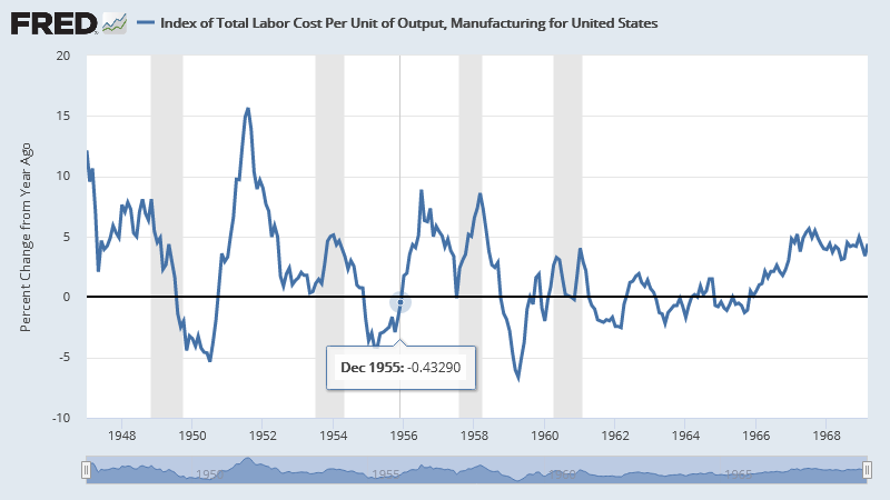 For US manufacturing, "percent change from year ago" of Total Labor Cost Per Unit of Output was still negative as of December 1955, after a whole year of employment expansion and labor force growth.